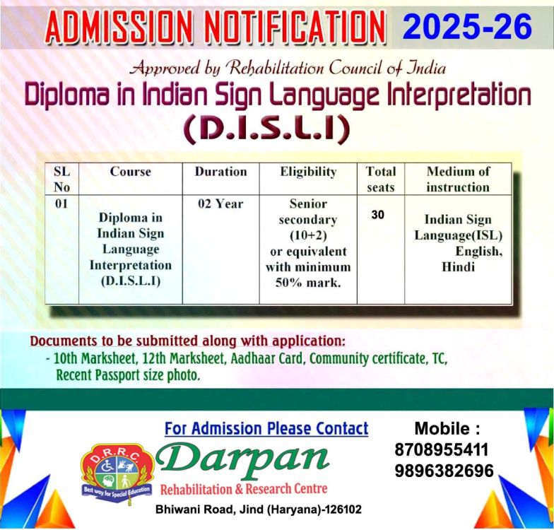Admission open for Diploma in Indian Sign Language Interpreter (D.I.S.L.I) , B.C.A.D.Ed.Special Education ( IDD & HI ) , B.Ed. Special Education ( ID & HI ) for the Session 2025-26